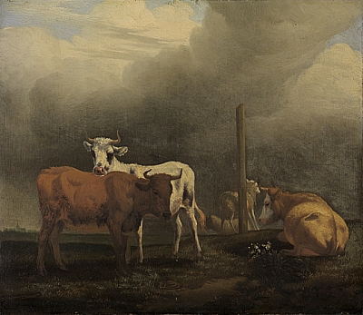 »N.o 6. Een Stuk van P. Potter met een bruine Koey op den voorgrond, waar agter een bont osje die met syn Kop over de bruyne Koey heen komt sien, ter syden een leggende Koe, wat verder in ’t land een Schuurpaal waar sig twee Schaapen schuuren alles verwonderlyk natuurlyk en schoon geschildert in syn beste tyd, hoog 1 voet 1 duym breed 1 voet 4 duym mede als voren gesteld op ............ f.[lorin] 600«