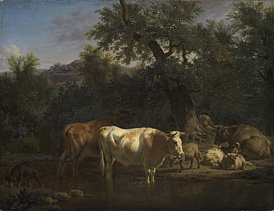 Erworben als Pendants im September 1761 durch Vermittlung von Johann Heinrich Eberts aus der Sammlung des Malers Jacques-André-Joseph Aved in Paris für insgesamt 2400 Livres. Teil des Erwerbungskonvoluts waren zwei Gemälde von Chardin ( Chardin, Jean Baptiste Siméon: Stillleben mit Zinnkrug und Pfirsichen und Chardin, Jean Baptiste Siméon: Stillleben mit Glasflasche und Früchten) sowie zwei Mignons ( Mignon, Abraham: Fruchtstillleben von Trauben und Pfirsichen mit einer Eidechse und Mignon, Abraham: Fruchtstillleben mit Pfirsichen, Trauben und Aprikosen). »Melling-Inventar« 1784, Nr. 172 ( Velde, Adriaen van de: Ruhender Hirte bei seiner Herde), vermutlich Nr. 165 (Velde, Adriaen van de: Rinder und Schafe am Waldwasser) |