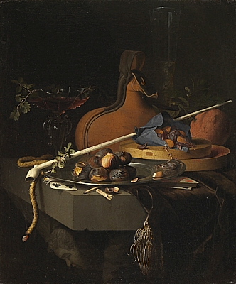 Stillleben mit Kastanien auf einem Teller, einer Tonpfeife und Rauchzubehör |