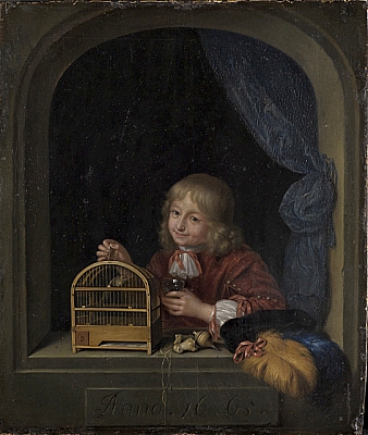 Knabe mit Vogelkäfig im Fenster |