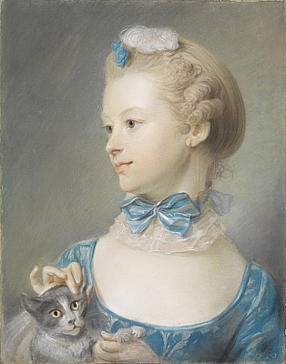 Erworben wohl im Juni 1750 für 10 Louis d'or direkt vom Künstler. Im Teilungsinventar 1783/84, Nr. 54, als »Frauenzimmer mit einer Katz« ohne Angabe des Künstlers aufgeführt (zwei weitere Frauenbildnisse in Pastell von Perronneau im Besitz Karoline Luises: Teilungs-Inventar 1783/84, Nr. 446 und »Melling-Inventar« 1784, Nr. 10). In der Familie weitervererbt, 1983 erworben von der Staatlichen Kunsthalle Karlsruhe. Vielleicht »Melling-Inventar« 1784, Nr. 10 |