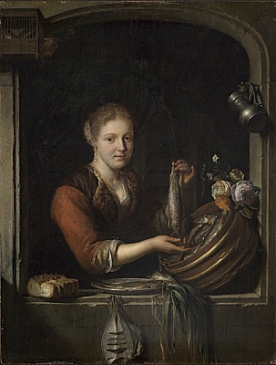 Die Fischhändlerin ist auf ein ovales Stück Holz gemalt, das man später in eine rechteckige Tafel eingesetzt hat. Die Figur schrieb man Gerard Dou zu, Umgebung und Beiwerk hingegen Carel de Moor.