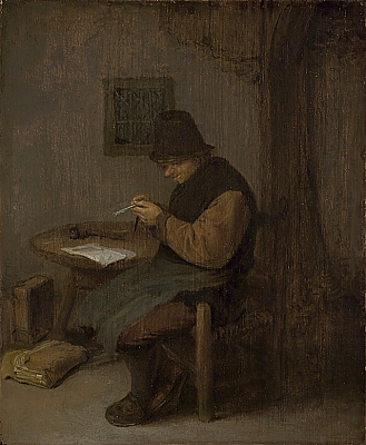 »No: 3: – un tablaux par adriaan van ostade representent un filosophe dans son etude, qui est ocupees a tailler une plume cet un tablaux rar est qui est connu sous le nom de het penne snydertie hautteur 8½ pous largeur 7: pous le prix est de ………. 32 –:–«